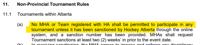 Teams are also reminded to ensure that any tournaments they plan to attend are properly sanctioned through Hockey Alberta. Please note the following Hockey Alberta Regulation 11.1(a) regarding tournament sanctioning: